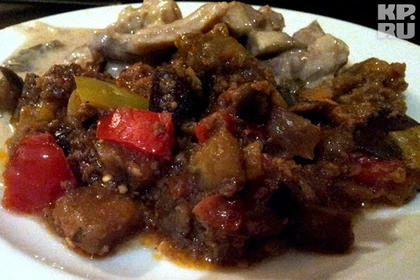 Приготовление: баклажаны очистить, нарезать тонкими кружочками, залить водой. В фарш добавить измельченный лук, соль и перец, после чего выложить на сковороду и тушить около десяти минут, добавив немного воды. Отдельно обжарить баклажаны. После чего в кастрюлю выложить ингредиенты, чередуя слоями нарезанные помидоры, баклажаны, фарш, рубленную зелень, не забывая присаливать и добавлять специи, затем залить водой и поставить на медленный огонь примерно на час.
